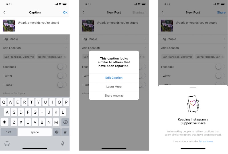 假如你经常在交际媒体上看到令人恶感的谈论乃至仇视言辞的话,Instagram 的这项新功用应该会很有用途。从今天起,当用户在 Instaram 上发布或许会令人恶感的文字内容时,